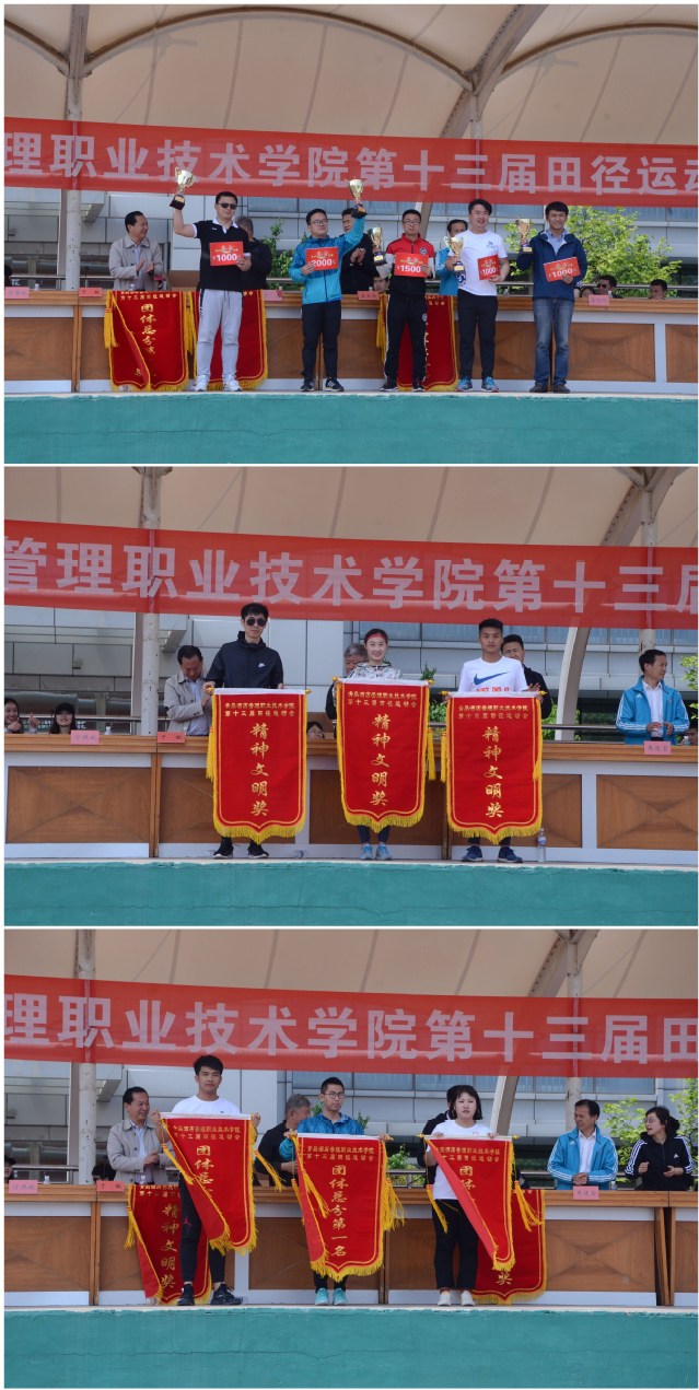 闭幕式上,运动会总裁判长夏飞宣布了竞赛团体总分成绩,旅游与酒店管理学院、工商管理学院、酒店工程学院获得学生组团体总分前三名,基础思政部、工商管理学院、旅游与酒店管理学院获得教工组团体总分前三名;于敏宣布了获得精神文明奖的单位名单,旅游与酒店管理学院、工商管理学院、烹饪学院获得学生组精神文明奖,工程学院、行政二队获得教工组精神文明奖。学院领导向获得运动会竞赛团体总分前三名和精神文明奖的单位颁发了锦旗。