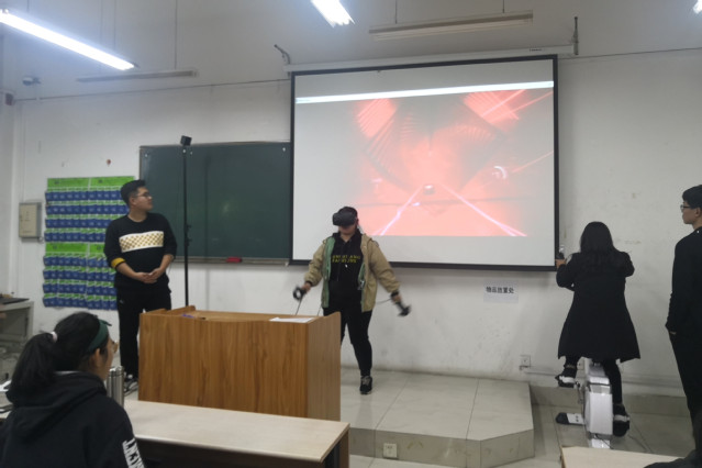 会上,青岛科技大学研究院专家为同学们现场展示了为中石化安工院、青岛港、艾默生等企业开发的项目案例,用科技带动兴趣,充分展现了VR+在行业应用中的巨大魅力。企业团队向同学们介绍了自主研发的VR产品及研发经验,并就VR产业现状、发展、行业应用、VR关键技术、VR人才就业做了宣介。带领同学们观赏了VR产品在9个不同行业的应用案例。