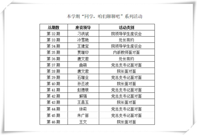 本网讯(学生工作处 陈超)近日,随着第46期“同学,咱们聊聊吧”活动的结束,本学期“同学,咱们聊聊吧”系列活动落下帷幕。