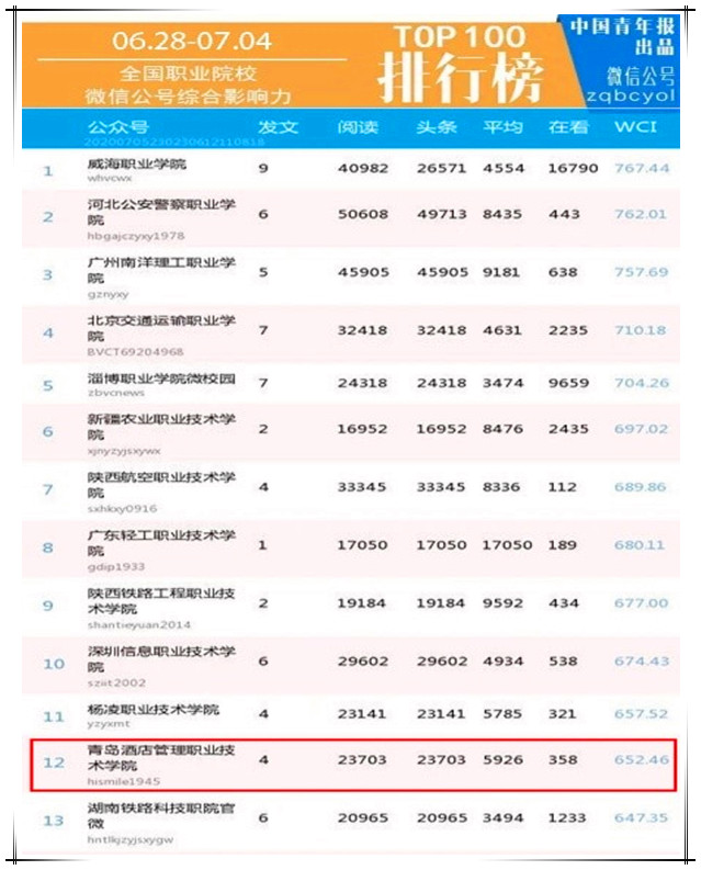 本网讯(宣传统战部 李代玉)7月6日,在中国青年报出品的《全国普通高校微信公号排行榜[6.28-7.4]》中,学院官方微信公众号“beat365中国官网(hismile1945)”综合影响力位列全国职业院校第十二位,四篇推文全部进入全国职业院校单周文章阅读量top100排行榜。