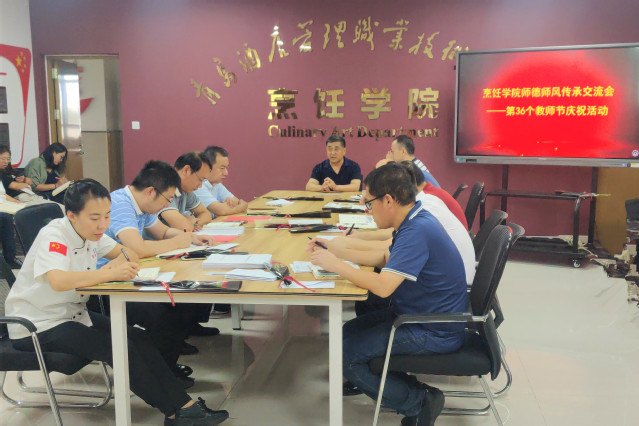 本网讯(烹饪学院 张坦)9月10日,烹饪学院举行师德师风传承交流会,开展第36个教师节庆祝活动,讲好身边榜样故事,弘扬烹饪行业师徒传承传统文化,增强广大教师的职业荣誉感、责任感和使命感。