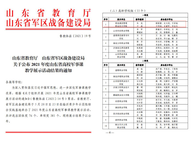 本网讯(学生工作处 朱龙)近日,山东省教育厅公布了2021年山东省高校军事课教学展示活动结果,我院代表队获得全省高职组团体一等奖、总分第一名,在全部五个赛项中,赢得四个一等奖、一个三等奖。