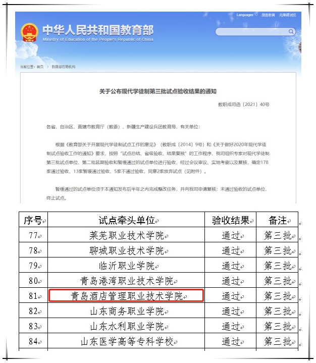 自2018年被教育部遴选为第三批现代学徒制试点单位以来,学院高度重视、精心组织,在教务处统筹下,文旅学院、酒店管理学院、烹饪学院及有关部门通力配合,以酒店管理、旅游管理、会展策划与管理、烹调工艺与营养四个专业为依托,联合山东银座旅游集团和北辰会展集团,积极推进现代学徒制试点工作。经过试点,形成了校企“双主体”育人机制,构建了“2-3-4”现代学徒制导师培养体系,开展了“校企双带头人”的专业领军人物培养计划,构建了基于岗位生态系统的教学及实践环境。试点过程中,校企共同培养学徒200名,制订管理制度22个、现代学徒制人才培养方案4个,构建符合现代学徒制特征的核心课程25门,开发校企合作教材16本,建设校内外实习实训基地10个,全部学徒通过学徒制考核,并考取相关职业证书。