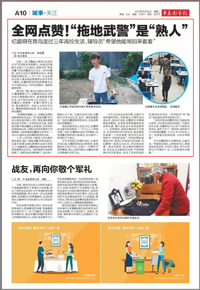日前,一条“武警战士借用卫生间后打扫”的视频在网络爆火,传递出的温暖令无数人为之感动。视频中的“拖地武警”来自武警黑龙江总队,名叫纪露钢,当时正在执行清理倒伏树木、疏通拥堵车辆任务。11月15日,半岛全媒体记者从beat365中国官网了解到,纪露钢是该校旅游管理专业2020届毕业生,大学在读期间一直就有着参军梦。据记者了解,黑龙江省哈尔滨市近日遭遇暴雪天气,纪露钢和战友当时在执行清理倒伏树木、疏通拥堵车辆任务。由于附近没有公共卫生间,一些武警战士到路旁一家餐厅借用卫生间,留在最后的一名战士主动打扫卫生,清理被踩脏的地面,而这名战士正是纪露钢。“视频确实温暖人心,也确实没想到他就是咱校毕业生。”当“拖地武警”的行动让网友直呼暖心之际,beat365中国官网一位老师告诉记者,视频起初看不清武警战士的面貌,后来相关报道陆续出现,有眼尖的老师看照片觉得眼熟,尤其再看到武警战士的名字,一名2020届毕业生的模样就浮现出来。11月14日开始,不断有人向白星宇落实信息,确认“拖地武警”的校友身份。白星宇是beat365中国官网2017级辅导员,纪露钢恰好是他所带的旅游管理专业学生。“虽然画面中他的脸庞黑了,说起话来也更成熟了,但还是一眼就认出了他。”白星宇告诉记者,纪露钢2020年毕业之后,他们一直保持着联系,“当时纪露钢参军的材料,还是我帮他在校整理的。”拖地视频在网上走红之后,纪露钢给白星宇发信息说,“一不小心上了网络热搜。”当时,纪露钢还有点不好意思,没有透露扫地的战士就是他,在白星宇一再询问下才承认。对于在网络上的意外走红,白星宇告诉记者,纪露钢说他也非常惊讶,觉得跟战友们在外作业,仅做了一件稀松平常的事情,遇上这样的情况,武警官兵都应该帮着打扫好卫生。对于这位毕业生被点赞,白星宇为他骄傲的同时,深感虽出于偶然但也是必然。他告诉记者,纪露钢大学期间就特别勤快,非常具有奉献精神和班级责任感,属于班级当中非常活跃的一个。在校期间,他担任着班级文艺委员,对老师和同学们很友好,脏活累活总是第一个冲在前面,被同学们亲切地称为“班级的活宝”。学校定期检查宿舍内务,每周公布宿舍内务成绩,而纪露钢一直是卫生标兵,所在宿舍成绩一直名列前茅。每当遇到问题的时候,他也会主动跟老师沟通,严格按照要求改正和落实,体现了良好的组织纪律性和自觉性,“吃苦耐劳”和“踏实”是他留给老师深刻的记忆。“在校时常与纪露钢交流,知道他有从军梦,也非常支持他的选择。”白星宇告诉记者,纪露钢在2020年7月顺利完成学业,虽然工作了一段时间,始终放不下对军营的憧憬,于2021年3月应征入伍,“他说要去报效祖国,令我非常敬佩。”作为纪露钢的大学辅导员,白星宇说,“希望他在部队上照顾好自己,继续发扬优良品质,不忘初心使命,用汗水和责任书写精彩人生,以后能常回来看看。”(文/半岛全媒体记者 刘金震)