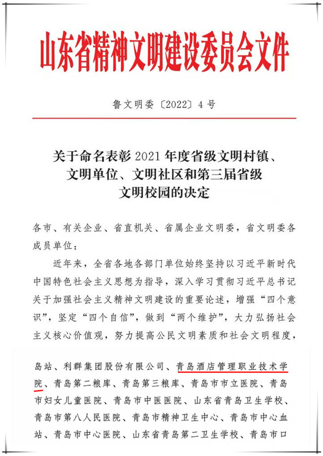 本网讯(党委宣传统战部 周晓莉)近日,省文明委下发《关于命名表彰2021年度省级文明村镇、文明单位、文明社区和第三届省级文明校园的决定》(鲁文明委〔2022〕4号),学校顺利通过2021年度省级文明校园、省级文明单位复查工作,继续保留省级文明校园、省级文明单位称号。