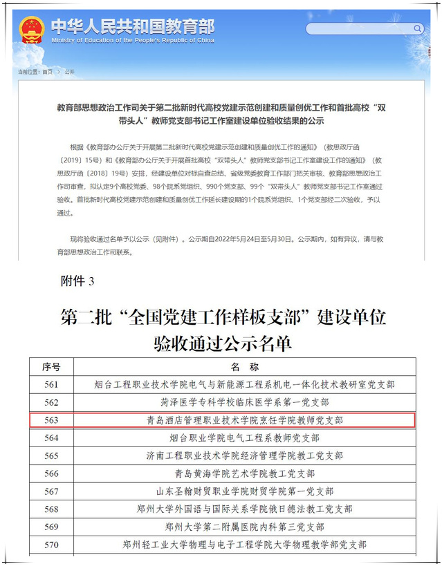 本网讯(烹饪学院 组织人事处)日前,教育部思想政治工作司公布了第二批新时代高校党建示范创建和质量创优工作建设单位验收结果公示名单,烹饪学院教师党支部经对标自查总结、省级党委教育工作部门把关审核、教育部思想政治工作司审查,顺利通过验收。
