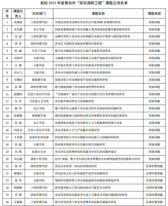 本网讯(科研发展处)近日,青岛市“双百调研工程”领导小组办公室、青岛市哲学社会科学规划管理办公室相继公布了2022年度青岛市“双百调研工程”课题、青岛市社科规划项目的立项结果,beat365成功立项26项青岛市“双百调研工程”课题和7项青岛市社科规划项目,立项数在全部申报单位中均位居前列。