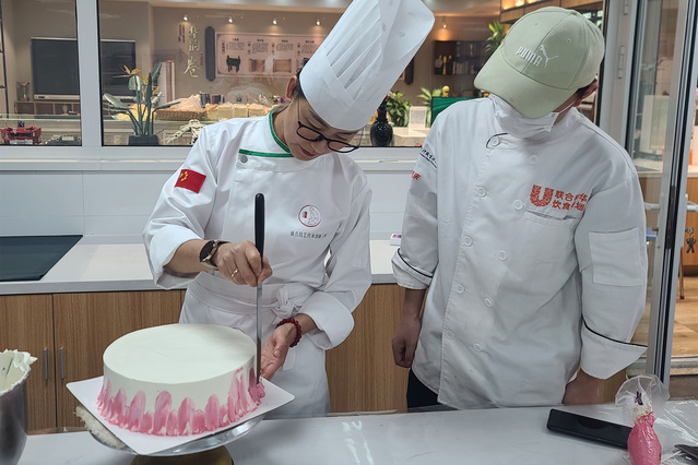 技能熔铸师生情,匠心育人显担当。烹饪学院结合烹饪专业特色及学生需求,将党的二十大精神切实融入教学和实践,由面点工坊大师带领学生在烘焙工艺课堂上,携手制作“学习二十大”裱花蛋糕。在大师的悉心指导下,学生们精准调色、细致裱花、严谨塑形,在创作过程中生动阐述理想与抱负、责任与担当,用实际行动奏响技能报国的最强音。在雕刻技能课堂中,实训教师以现场雕刻、互动教学等形式指导学生进行雕刻制作,将党的二十大精神融入雕刻技艺,学生们在一凿一刻中以“匠心”致“初心”,展现烹饪学子对党、对祖国的热爱之情和昂扬向上的精神面貌。