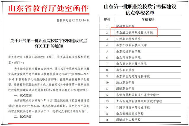 6月2日,省教育厅印发《关于开展第一批职业院校数字校园建设试点有关工作的通知》(鲁教职处函〔2022〕26号),学校入选全省第一批职业院校数字校园建设试点单位,在扩大优质资源供给、加强平台资源应用、拓展应用场景、深化教育评价改革、提高数字化管理能力等方面开展试点改革。