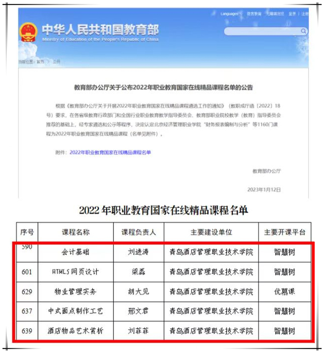 在课程推荐参加遴选阶段,教务处组建专门团队、召开专项会议,动员相关课程团队整改申报材料、完善课程内容,申报质量显著提升。教育部公示遴选结果阶段,教务处带动相关课程团队,充分研究专家组对拟入选课程的修改意见,逐一研讨修改事项,并联合课程平台进行了细致修改和完善。最终,刘进涛老师主持的《会计基础》、梁磊老师主持的《HTML5网页设计》、胡大见老师主持的《物业管理实务》、邢文君老师主持的《中式面点制作工艺》、刘菲菲老师主持的《酒店物品艺术赏析》等5门公示课程全部成功入选。