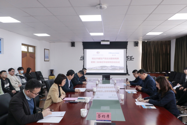 本网讯(信息工程技术学院 涂振)3月31日,信息工程技术学院在行政楼三楼会议室举行“校企共建生产性实训基地揭牌暨第二批海信学徒制班”启动仪式,青岛海信信息科技股份有限公司总经理孙钦平、学校副校长张宗国参加活动。