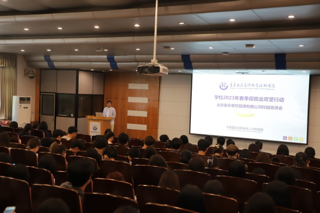 本网讯(招生就业办公室 刘卿文)为贯彻落实党中央、国务院“稳就业”“保就业”决策部署,根据上级主管部门就业工作会议精神,结合学校2023年春季促就业攻坚行动方案要求,5月29日下午,学校邀请北京鲁采餐饮管理有限公司到校开展“万企进校园”宣讲首场活动,稳步推进学校就业工作。学校副校长、工会主席姜玲玲主持。