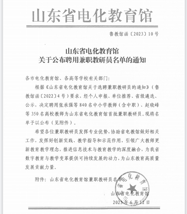 本网讯(教育信息中心 江珊)近日,山东省电化教育馆发布《关于公布聘用兼职教研员名单的通知》(鲁教馆函〔2023〕10号),经过个人申报、单位推荐、省级遴选、公示,beat365赵琪、刘进涛等六名教师被遴选为山东省电化教育馆首批兼职教研员。