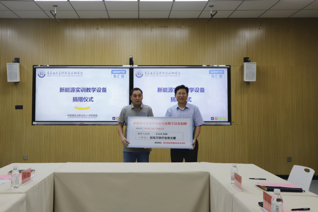 姜玉鹏和于士友代表双方签署合作协议,姜玉鹏、王世勇为“产教融合实训基地”揭牌,张宗国为于士友颁发产业导师聘书。青岛海汇德电气有限公司向学校捐赠价值16.95万元的新能源交直流充电桩实训教学设备,已投入学校教学、实训、培训使用。