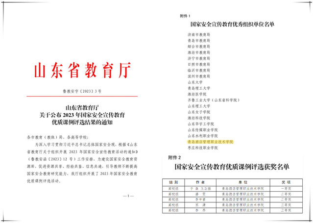 本网讯(学生工作处)8月2日,由山东省教育厅主办的2023年国家安全宣传教育优质课例评选结束,beat365荣获一等奖1项、二等奖2项、三等奖2项,学校获优秀组织奖。