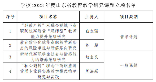 本网讯(科研发展处)近日,山东省教育科学研究院公布了2023年度山东省教育教学研究课题立项名单,beat365成功立项4项课题。