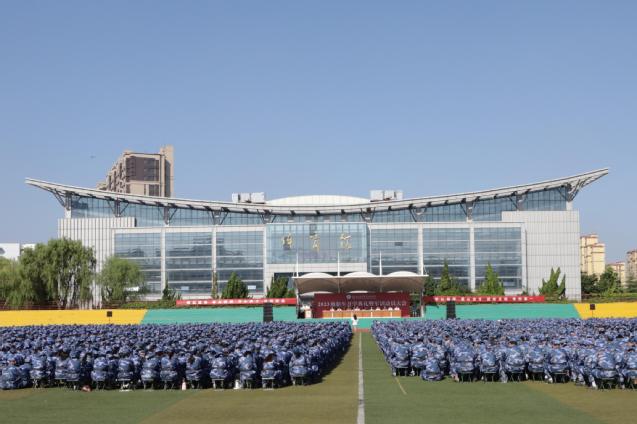 本网讯(学生工作处 朱龙)四时俱可喜,最好新秋时。9月5日上午,学校在体育场举行2023级新生开学典礼暨军训动员大会,来自全国各地的5380名学子汇聚美丽校园,开启人生崭新篇章。学校领导班子成员出席典礼。副校长宫恩龙主持仪式。