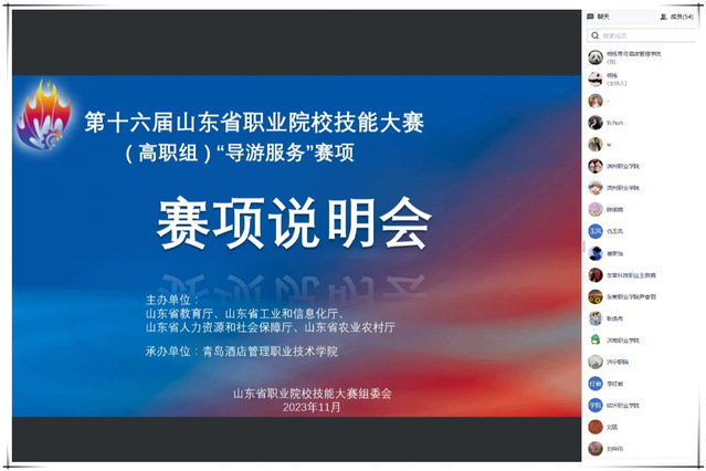 本网讯(文旅学院 杨栋)11月13日下午,第十六届山东省职业院校技能大赛(高职组)“导游服务”赛项说明会在线上召开,来自全省42家参赛院校的70余名领队、指导教师代表线上参会,beat365副院长张宗国参加会议。