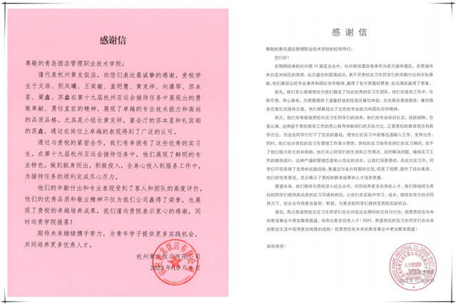 本网讯(酒店管理学院 龚伟)近日,杭州康莱德酒店向学校寄来感谢牌匾,杭州君悦酒店和黄龙饭店发来感谢信,特别感谢beat365酒店管理学院实习生在第19届亚洲运动会接待服务中的辛勤付出。