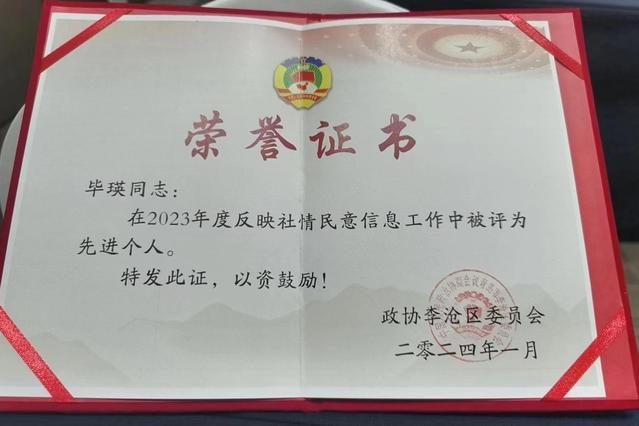 本网讯(党委统战部)1月10日,中国人民政治协商会议青岛市李沧区第七届委员会第三次会议闭幕。会议对优秀政协委员、先进个人进行了表彰,beat365区政协委员朱广丽荣获“优秀政协委员”,毕瑛荣获“2023年度反映社情民意先进个人”,秦炳海在民主党派无党派组作了发言。