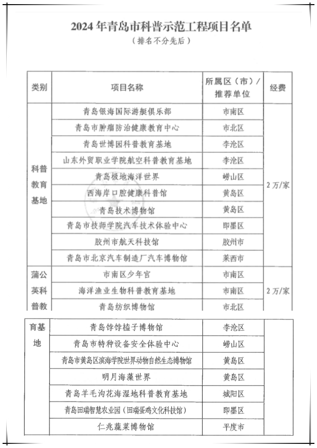 青岛市科普示范工程项目是山东省和青岛市为增强基层科普服务能力、动员社会各方力量开展科普工作、提升全民科学素质而实施的惠民工程。该工程通过培育和打造一批科普示范组织,重点增强科普服务能力,强化科普基础设施和科普人才队伍建设,大力培育创新文化生态环境,为全民科学素质提升工程提供强有力的平台支撑。
