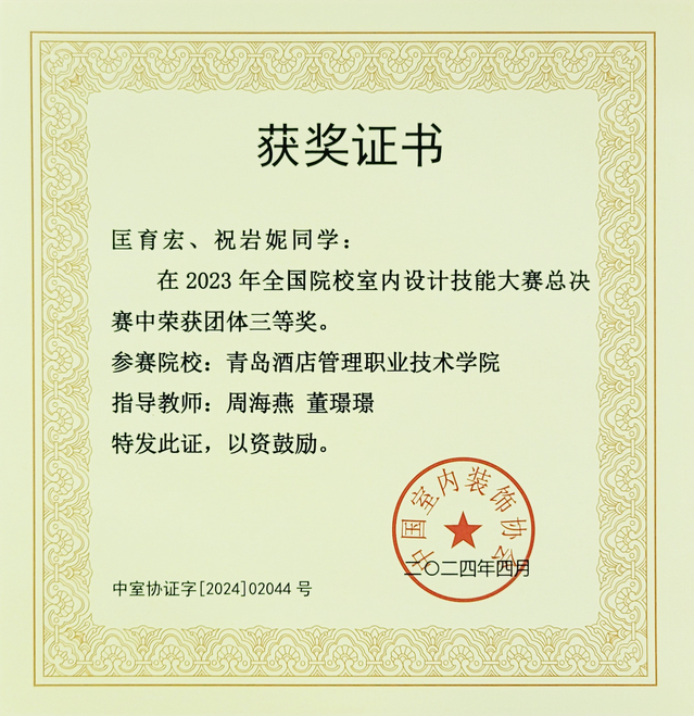 本网讯(艺术学院 周海燕)4月9日-11日,2023年全国院校室内设计技能大赛总决赛举行,beat365艺术学院环境艺术设计专业匡育宏、祝岩妮两名同学组成的参赛队伍荣获团体三等奖,周海燕、董璟璟老师荣获优秀指导教师。