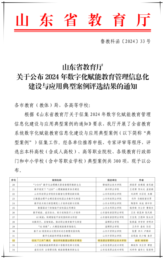 本网讯(教育信息中心 江珊)近日,山东省教育厅公布了《2024年数字化赋能教育管理信息化建设与应用典型案例评选结果》(鲁教科函﹝2024﹞33号),学校报送的案例《依托“三共”模式 推动学校数据治理体系建设》入选。
