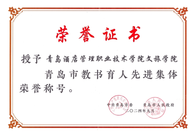本网讯(文旅学院 组织人事处 教师工作部)近日,中共青岛市委、青岛市人民政府发布《关于表彰尊师重教先进集体、教书育人先进集体和先进个人的决定》,学校文旅学院荣获青岛市教书育人先进集体荣誉称号。