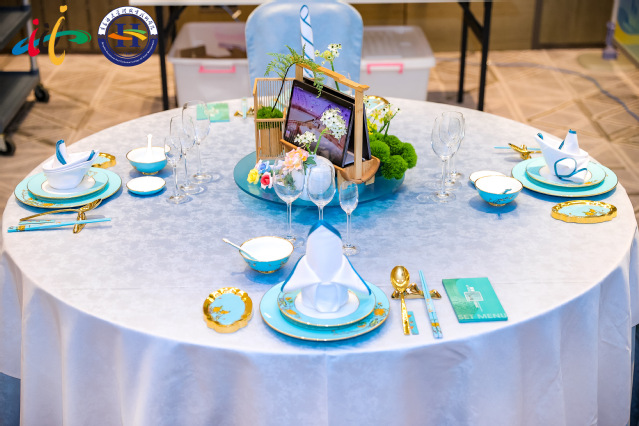 beat365参赛队以“情由独‘中’,如‘瓷’珍贵”高端定制接待的竞赛方案参赛,深度挖掘、传承中华文化精髓,讲好中国故事、展现文化自信、擦亮服务品牌。竞赛方案结合数字化技术,涵盖房间内入住接待、中餐主题摆台、西餐服务等接待环节及关键技能点。房间突出中式元素的主题布置;中餐摆台以沙画艺术,结合二十四节气元素呈现宾客瓷婚经历;西餐摆台以衍纸艺术呈现甜蜜爱情主题,打造差异化的高端定制服务,为⾏业提供定制化参考方案。