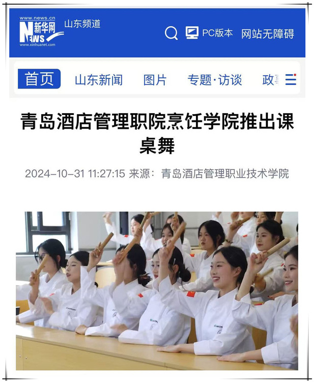 舞出精彩,工匠精神育人成效斐然。为充分发挥烹饪类专业优势,聚焦职业特色,用形体语言诉说工匠礼仪规范,用艺术形式展现工匠精神内涵,师生编排了专业曼舞——《味味道来·“桌”而不凡》,将思政元素巧妙融入实训课堂教学设计,学礼、习礼、用礼三者并重,实现润物无声、内化于心的思政教育效果。课桌舞视频推出后,在校园、社会引起热烈反响,被新华网、大众网等媒体转发和宣传,吸引大量点赞、转发。