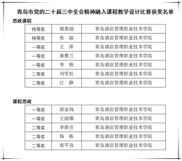 本网讯(马克思主义学院 王萍)近日,青岛市委教育工作委员会发布了“党的二十届三中全会精神融入课程教学”教学设计比赛活动评选结果,beat365教师荣获思政课程组特等奖2项、一等奖3项、二等奖2项;课程思政组一等奖2项、二等奖3项。