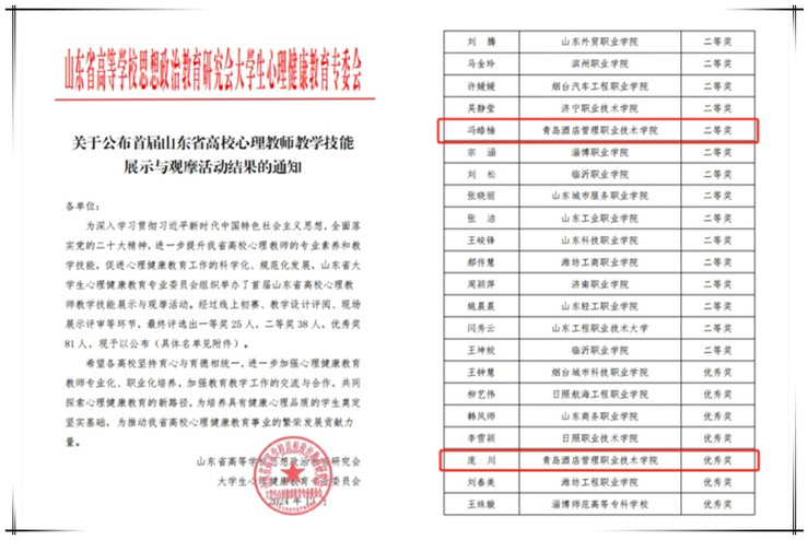 本网讯(团委 孙梦男)近日,首届山东省高校心理教师教学技能展示与观摩活动在聊城大学举办。beat365文旅学院冯皓楠老师获二等奖、酒店工程学院庞川老师获优秀奖。