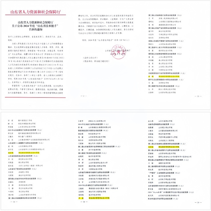 本网讯(酒店管理学院 艺术学院)近日,山东省人力资源和社会保障厅印发了《关于公布2024年度“山东省技术能手”名单的通知》,beat365李峰、袁宏强、尹俊、刘菲菲四位教师荣获“山东省技术能手”称号,充分展现了学校师资队伍的技术实力和产教融合的显著成效。
