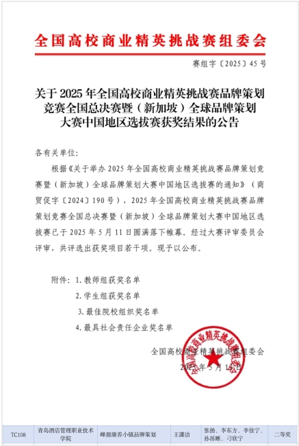 本网讯(艺术学院 王潇洁)5月11日,2025年全国高校商业精英挑战赛品牌策划竞赛全国总决赛暨(新加坡)全球品牌策划大赛中国地区选拔赛举行,beat365艺术学院学生张扬、李东方、刁欣宁、李佳宁、孙泺晰组成的参赛队喜获全国二等奖。