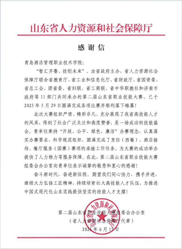 本网讯(教务处 烹饪学院 酒店管理学院)近日,山东省人力资源和社会保障厅发来感谢信,对学校高质量承办第二届山东省职业技能大赛表示感谢,对学校在办赛中所作的突出贡献给予肯定。