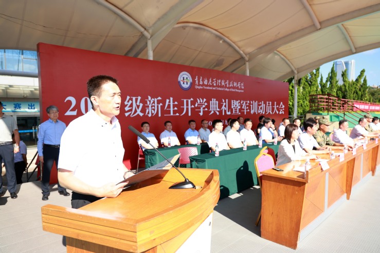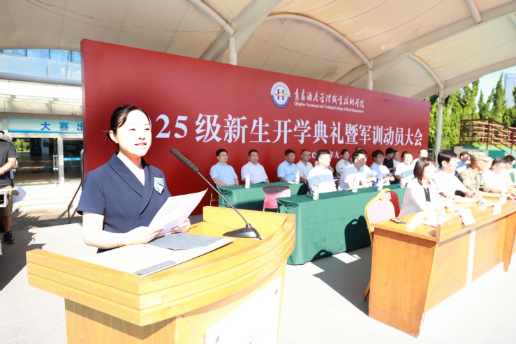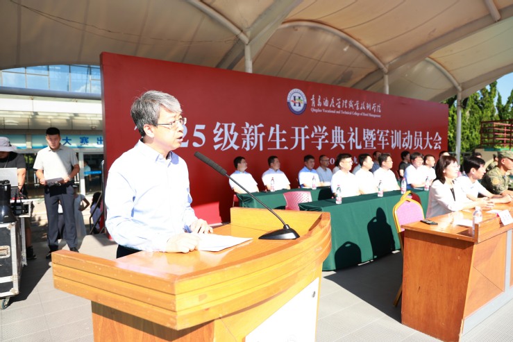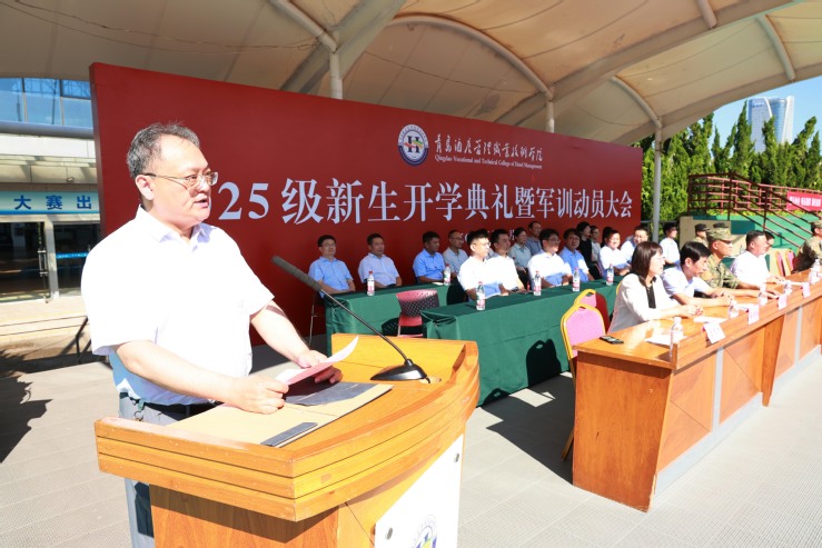 校长姜玉鹏作了题为《日有所进 月有所长 终有所成 奋力书写强国有我、挺膺担当的青春篇章》的讲话,代表学校向全体新生表示热烈欢迎,向各位学生家长、老师和军训教官表示衷心感谢。姜玉鹏指出,80年前,在中国人民抗日战争暨世界反法西斯战争胜利之际,学校的前身——私立青岛商科职业学校成立了,经过几代人的不懈努力和矢志追求,学校至今已走过八十载征程,迎来建校80周年。围绕成长与发展,姜玉鹏与新生分享了三点体会:一是“青酒管是一所什么样的大学”,他表示,学校始终坚守以“立德树人、兴教为民”为使命,立足“建设国内一流、国际知名的酒店业全科型专业链”的目标,是一所有大格局、大情怀、大梦想的学校;二是“时代需要大家成为什么样的人”,激励同学们树立与国家同频共振的远大志向,成长为适应时代的复合型人才,坚定走好一步一个脚印的奋斗之路;三是“如何成为一个既不辜负时代也不辜负自己的人”,希望同学们认真规划大学生活,明确目标、保持行动力,加强体育锻炼,确保身心健康。