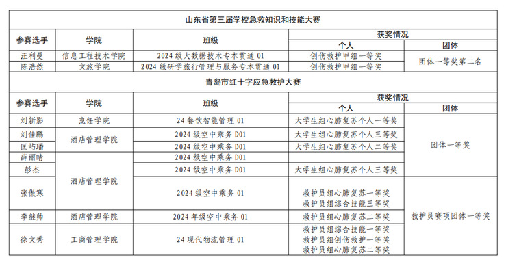 本网讯(总务处)9月26日,2025年山东省第三届学校急救知识和技能大赛及青岛市红十字应急救护大赛相继落下帷幕,学校选派的多支学生代表队表现优异,在省级与市级两项大赛中连创佳绩,荣获团体一等奖3项、个人一等奖6项,充分展现了学校在应急救护教育方面的卓越成效。